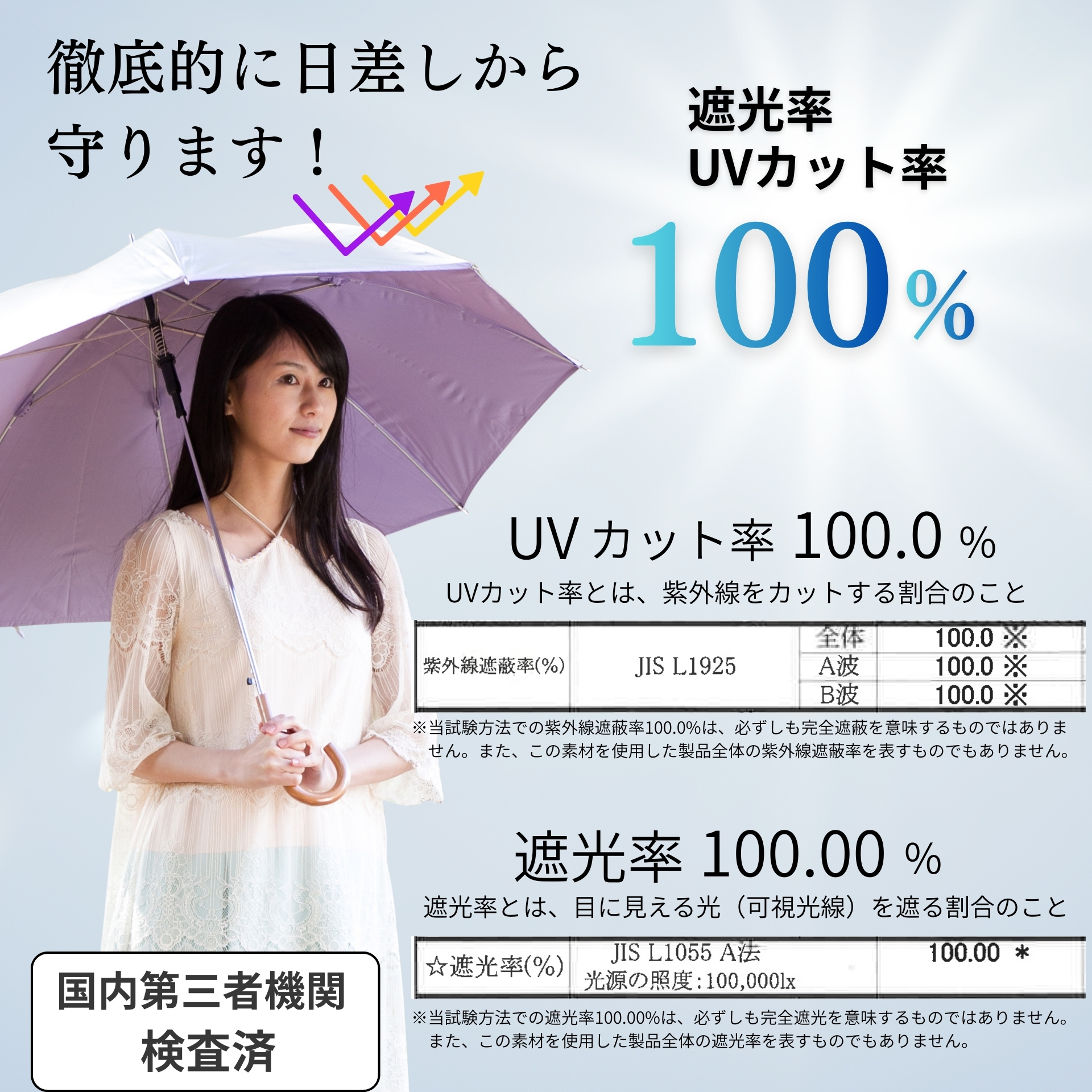 ■以下の点をご確認の上お買い求めください。 1.生地の検査結果は「遮光率100.00%」「UVカット率100.0%」となりますが、一般財団法人カケンテストセンターの見解の通り「完全遮光」を意味するものではありません。また傘として仕上げておりますので、ミシン縫製による縫い目から光が差し込むことがあります。 2.生地の特性上、光が透けて見えるとても小さな穴(ピンホール)がある場合があります。これは製造工程上避けられないことで、ピンホールがあっても、雨が濡れることもありません。そのため僅かなピンホールは良品として販売しております。ご了承くださいませ。 3. 生地に撥水加工が施してありますので、雨の日も使える晴雨兼用タイプです。雨傘としてご使用になられた後は、乾かしてからおしまいください。 4.ポリウレタンコーティングの性質上、尖ったものや硬いものとの摩擦により、コーティングがはがれる恐れがあります。ご了承ください。 5.生地の特性上、開封時に素材の臭いが感じられる場合があります。数日のご使用や陰干しなどで自然に軽減されていきます。 |