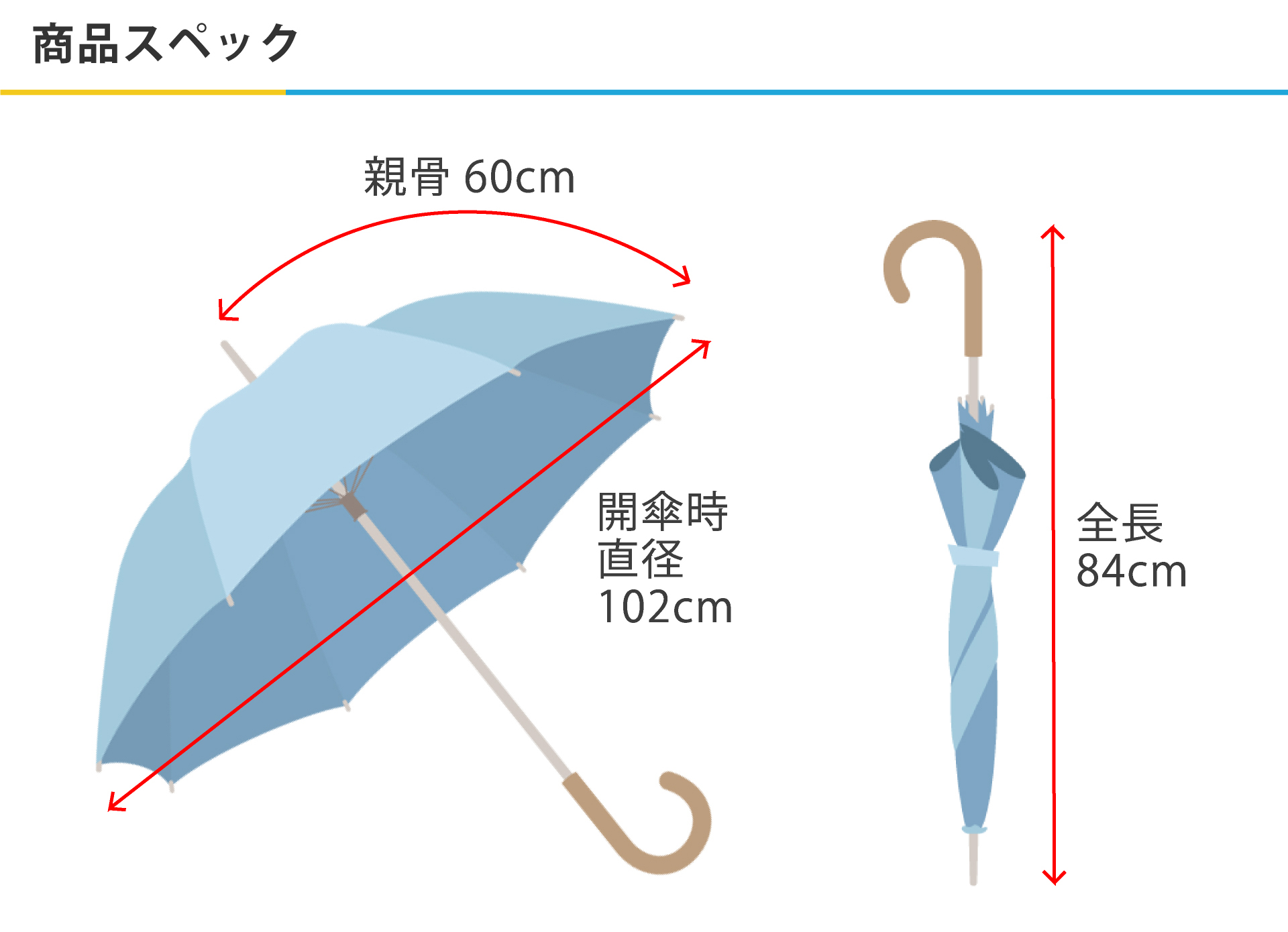 親骨:60cm×8本骨 全長:約84cm 開傘時直径:約102cm 重さ:約420g |