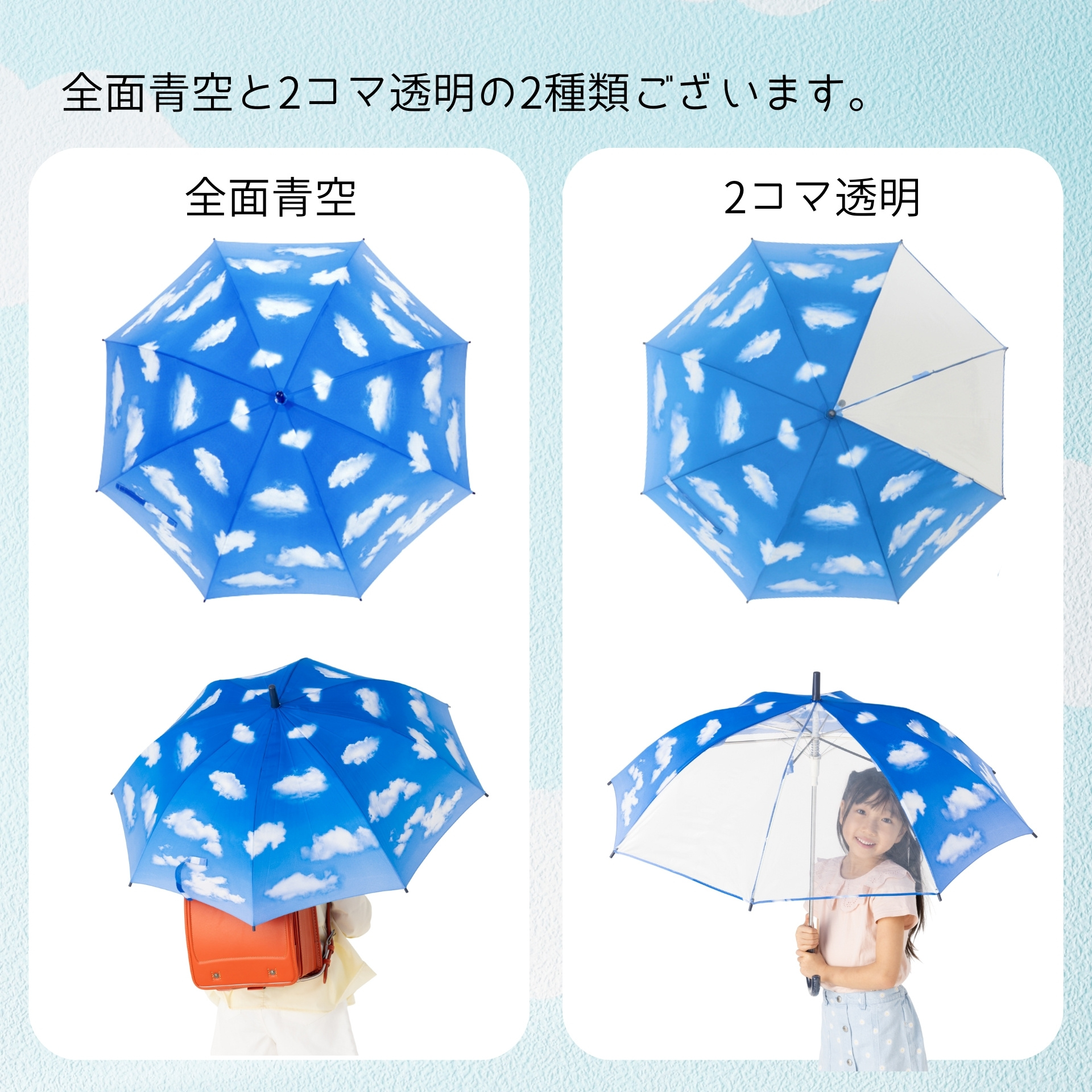 雨の日も青空気分! 雨の日も元気になれる青空プリントの傘! 大人用で好評なジャンプ傘青空の生地でかわいい学童傘を作りました。 大人用ジャンプ傘青空とお揃いでいかがですか? 親骨にグラスファイバーを使用し、軽くて丈夫です。 2面透明窓付きは、そこから前が見渡せます。 |