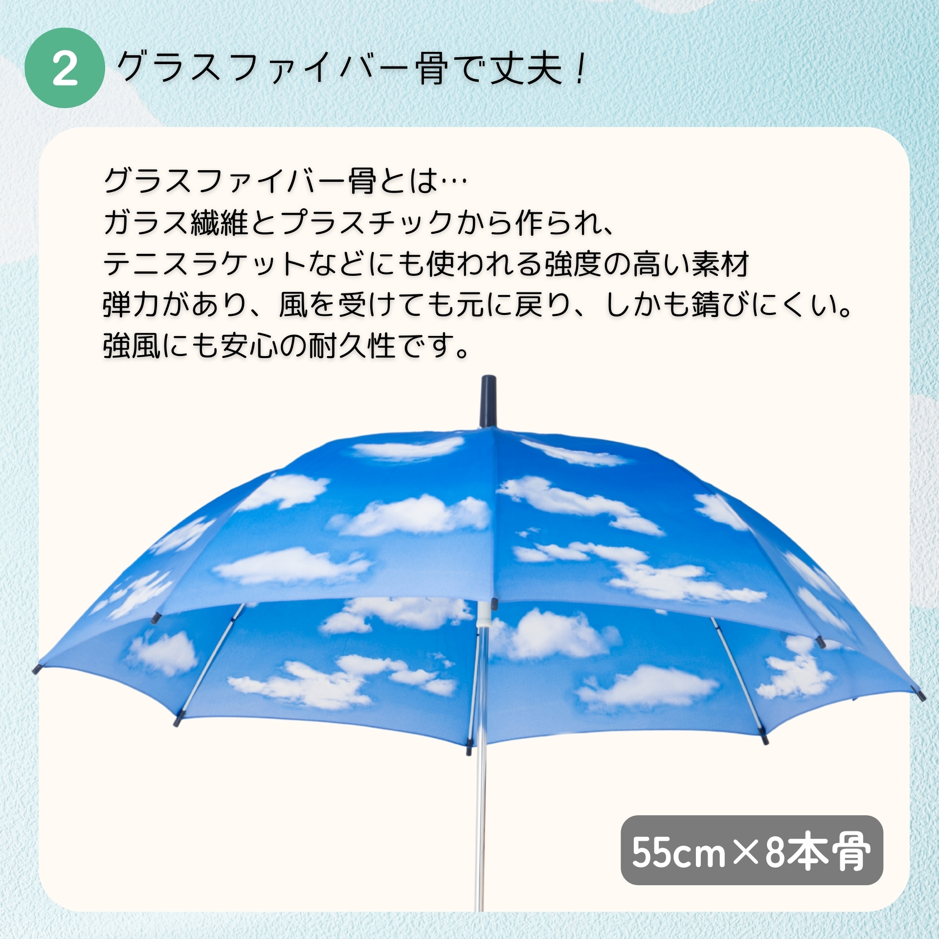 雨の日も青空気分。元気になれる青空プリントの傘。大人用で好評なジャンプ傘・青空の生地でかわいい学童傘を作りました。親骨にグラスファイバーを使用し、軽くて丈夫です。傘差し通学・傘さし登下校用、こども用、ソーシャルディスタンス用 タイプ:ジャンプ傘/カラー:青空/生地:ポリエステル100%/親骨:グラスファイバー/中棒:スチール/手元:樹脂/重さ420g/原産国:中国/親骨55cm×8本骨/全長74cm/開傘時直径91cm