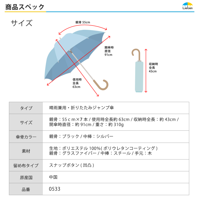 ■サイズ 親骨:55cm×7本骨 全長:約63cm 収納時全長:約43cm 開傘時直径:約91cm 重さ:約310g ■タイプ:晴雨兼用/折りたたみジャンプ傘 ■生地カラー:3種類(シルバー/ブラック・ゴールド/ブラック・ブルー/ブラック) ■傘骨カラー:親骨 ブラック・中棒 シルバー ■留め布タイプ:スナップボタン(凹凸) ■素材 生地:ポリエステル100%(ポリウレタンコーティング) 親骨:グラスファイバー 中棒:スチール 手元:木 ■原産国:中国 ■品番:LIEBEN-0533 ※LIEBEN-0531リニューアル