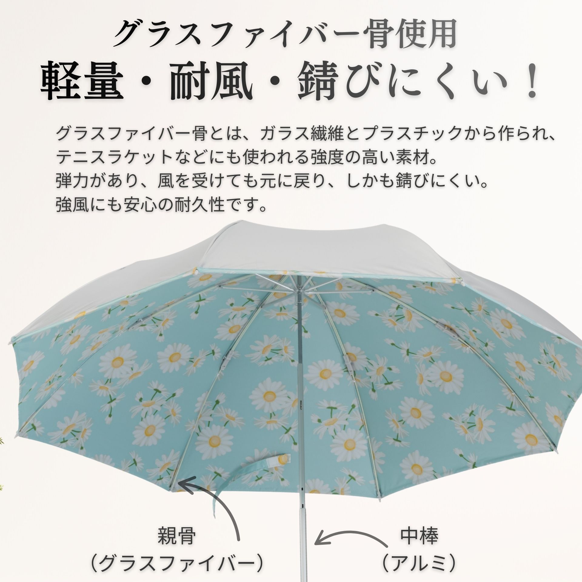 生地:ナイロン100%(ポリウレタンコーティング) 親骨:グラスファイバー 中棒:アルミ 手元:白=ABS樹脂/茶色=木