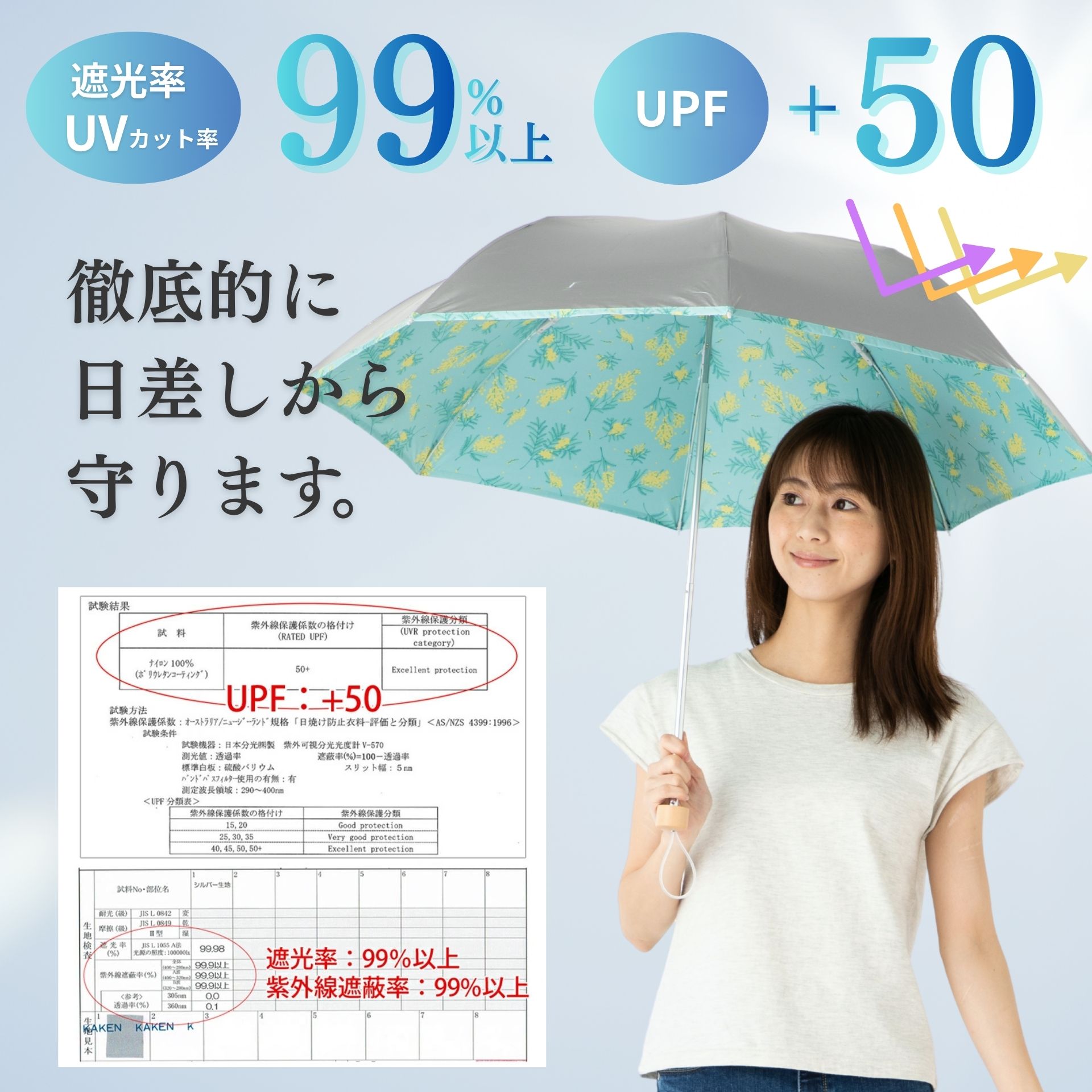 UVカット率99%。普通の日傘とは違います。傘の内側は木陰の涼しさ。シルバーコーティングで暑い日ざしをシャットアウト。太陽の直射日光が強い炎天下の中で違いを感じられると思います。 タイプ:折りたたみ傘(2つ折)/カラー:表シルバー 裏 柄(20種類)/生地:ナイロン100% ポリウレタンコーティング/親骨:グラスファイバー/中棒:アルミ/手元:白・ABS樹脂製、茶色・木製/重さ210g/原産国:中国/親骨50cm×8本骨/全長66cm/収納時全長31cm/開傘時直径86cm/収納時直径5cm