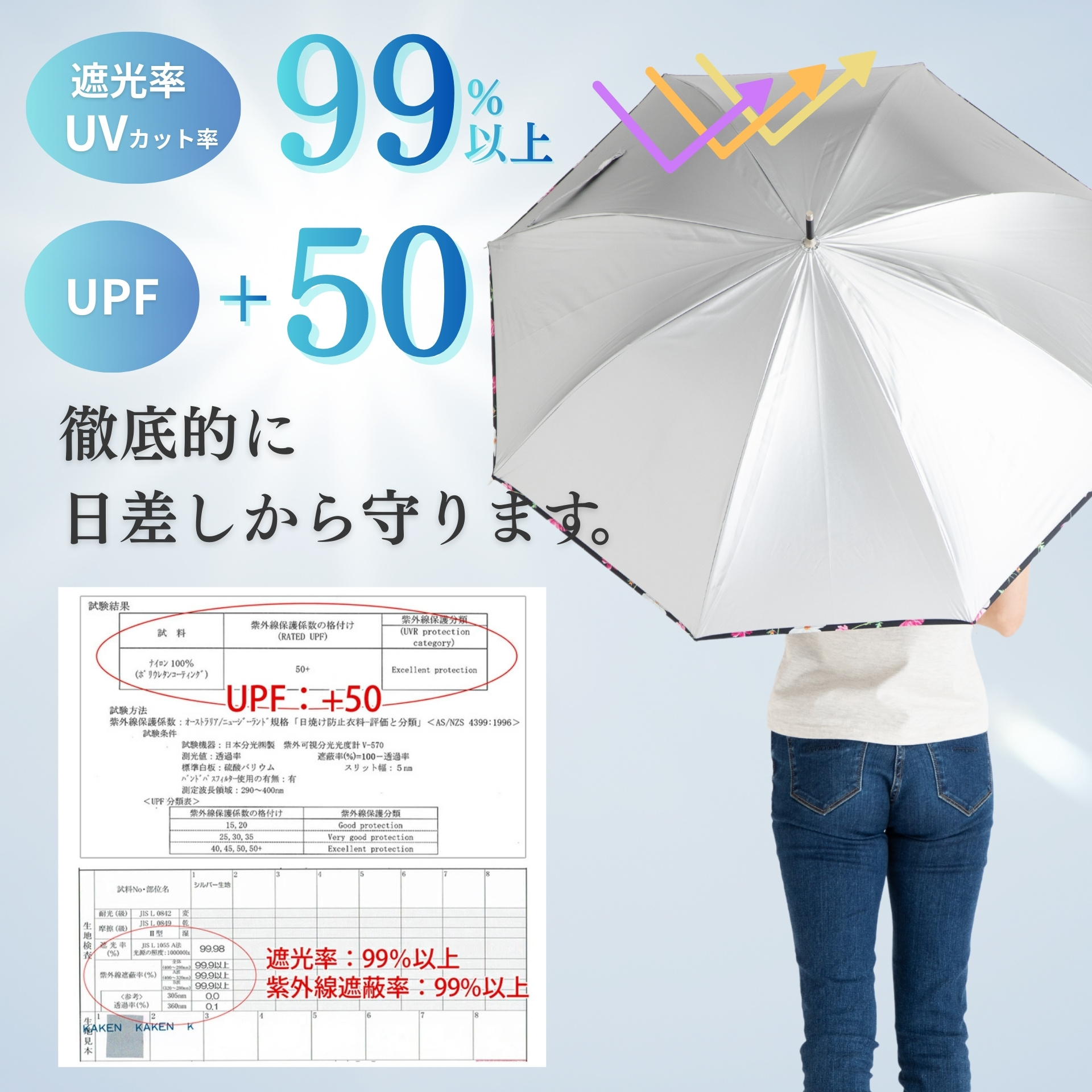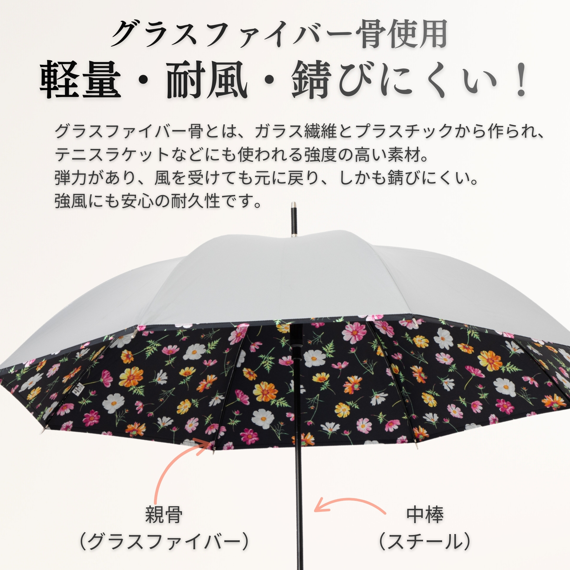 UVカット率99%以上、遮光率99%以上。傘の内側は木陰の涼しさ。遮熱・遮光効果あり。ゴルフや釣り用が一般的だったシルバーの傘を、女性用に花柄で作りました。骨も軽くて丈夫なグラスファイバーを使用したジャンプ傘。ひんやり日傘。シルバーコーティング。■タイプ:晴雨兼用傘/長傘/ジャンプ傘 ■サイズ 親骨:55cm×8本骨 全長:約81cm 開傘時直径:約96cm 重さ:約400g ■傘骨カラー:親骨 ブラック・中棒 ブラック ■留め布タイプ:マジックテープ ■素材 生地:ナイロン100%(ポリウレタンコーティング) 親骨:グラスファイバー 中棒:スチール 手元:ABS樹脂 ■原産国:中国 ■品番:1405bk