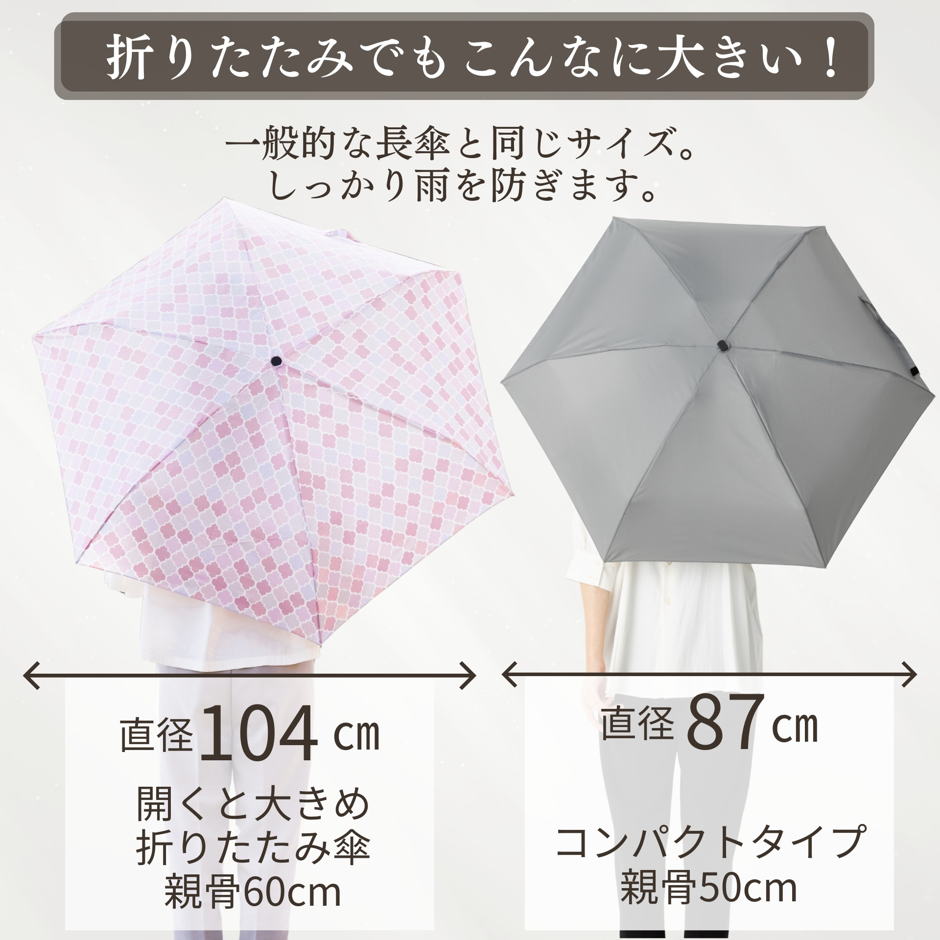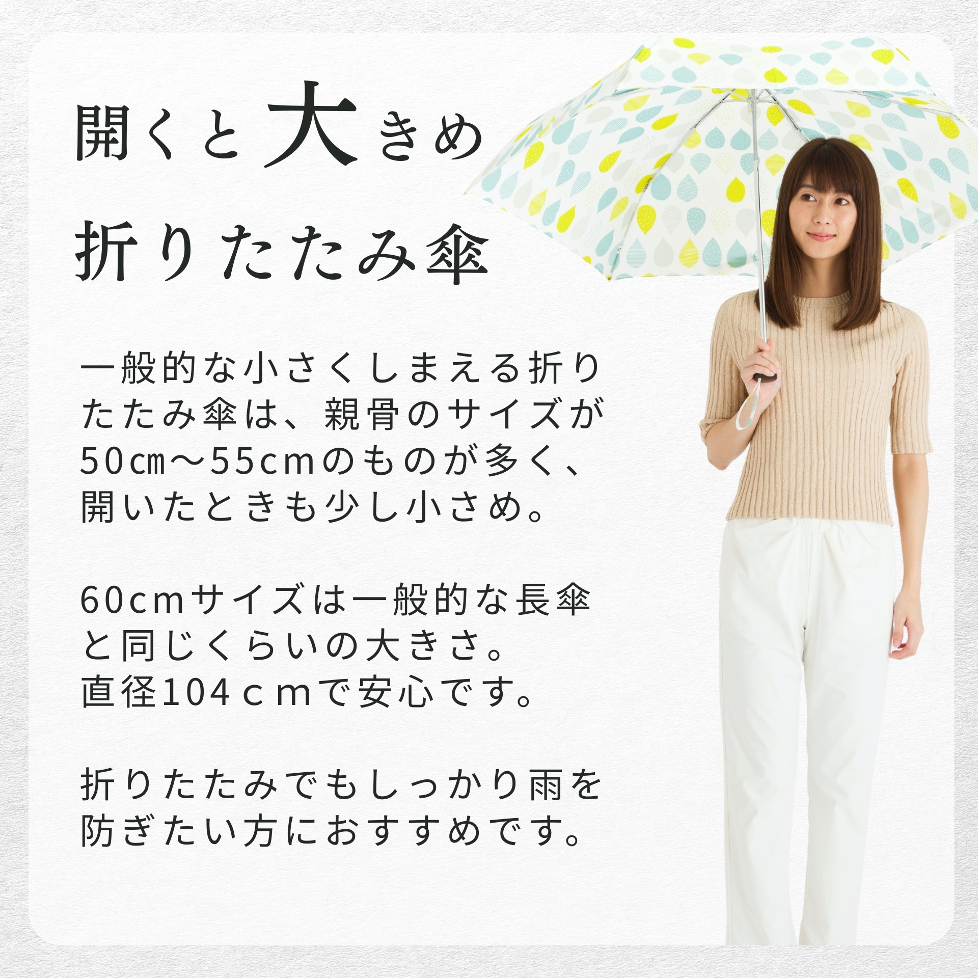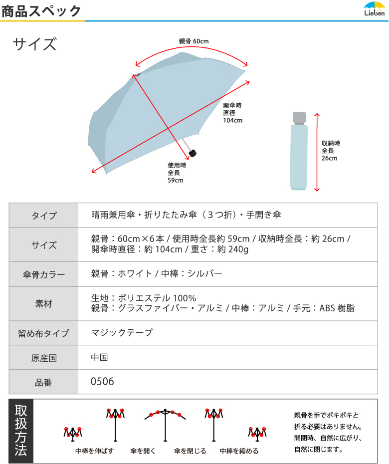 親骨:60cm×6本骨 収納時全長:約26cm 使用時全長:約59cm 開傘時直径:約104cm 重さ:約240g ■タイプ:晴雨兼用傘/折りたたみ傘(3つ折)/手開き傘 ■傘骨カラー:親骨・ホワイト/シルバー 中棒・シルバー ■留め布タイプ:マジックテープ ■素材 生地:ポリエステル100% 親骨:グラスファイバー/アルミ 中棒:アルミ 手元:ABS樹脂 ■原産国:中国 ■品番:LIEBEN-0501,LIEBEN-0505 |