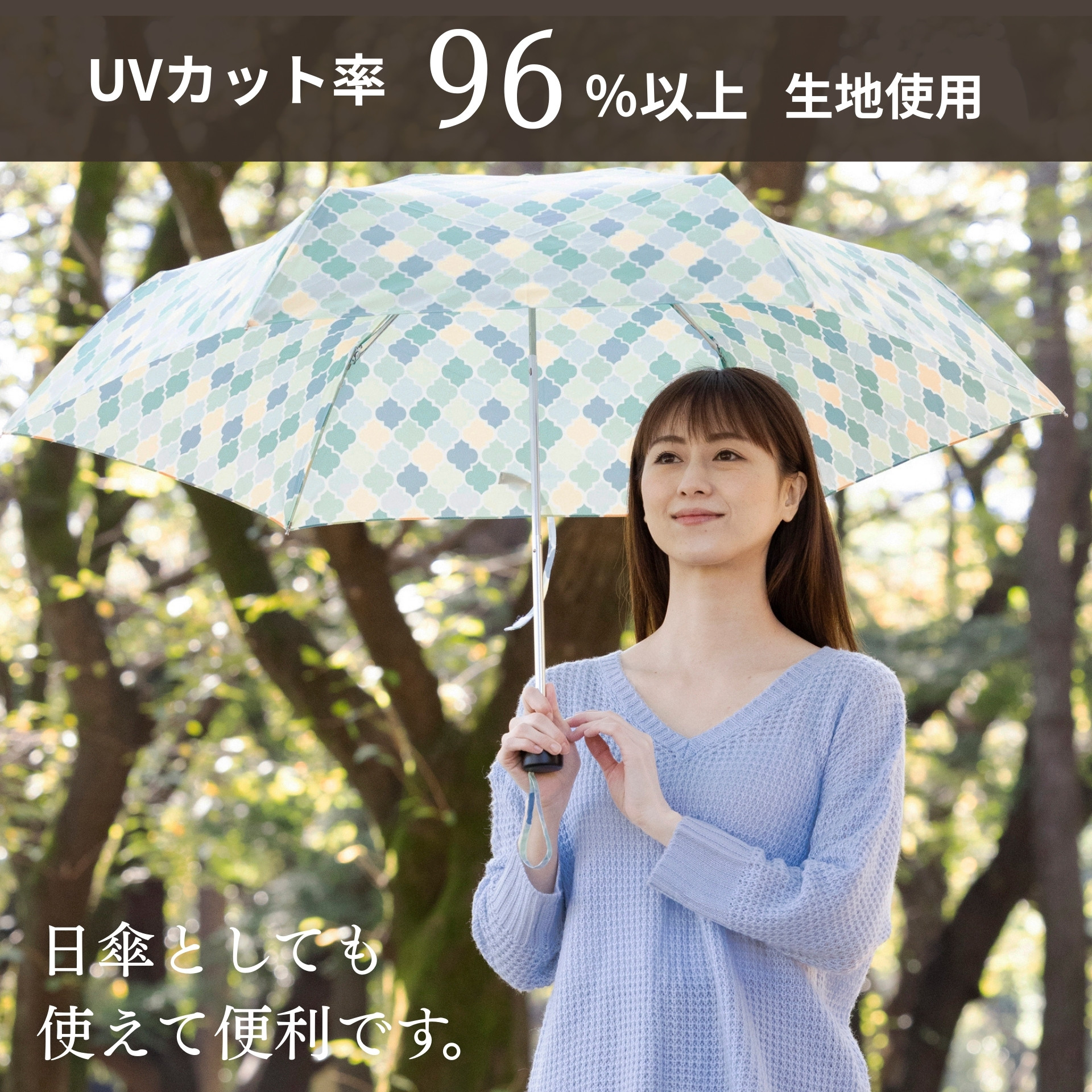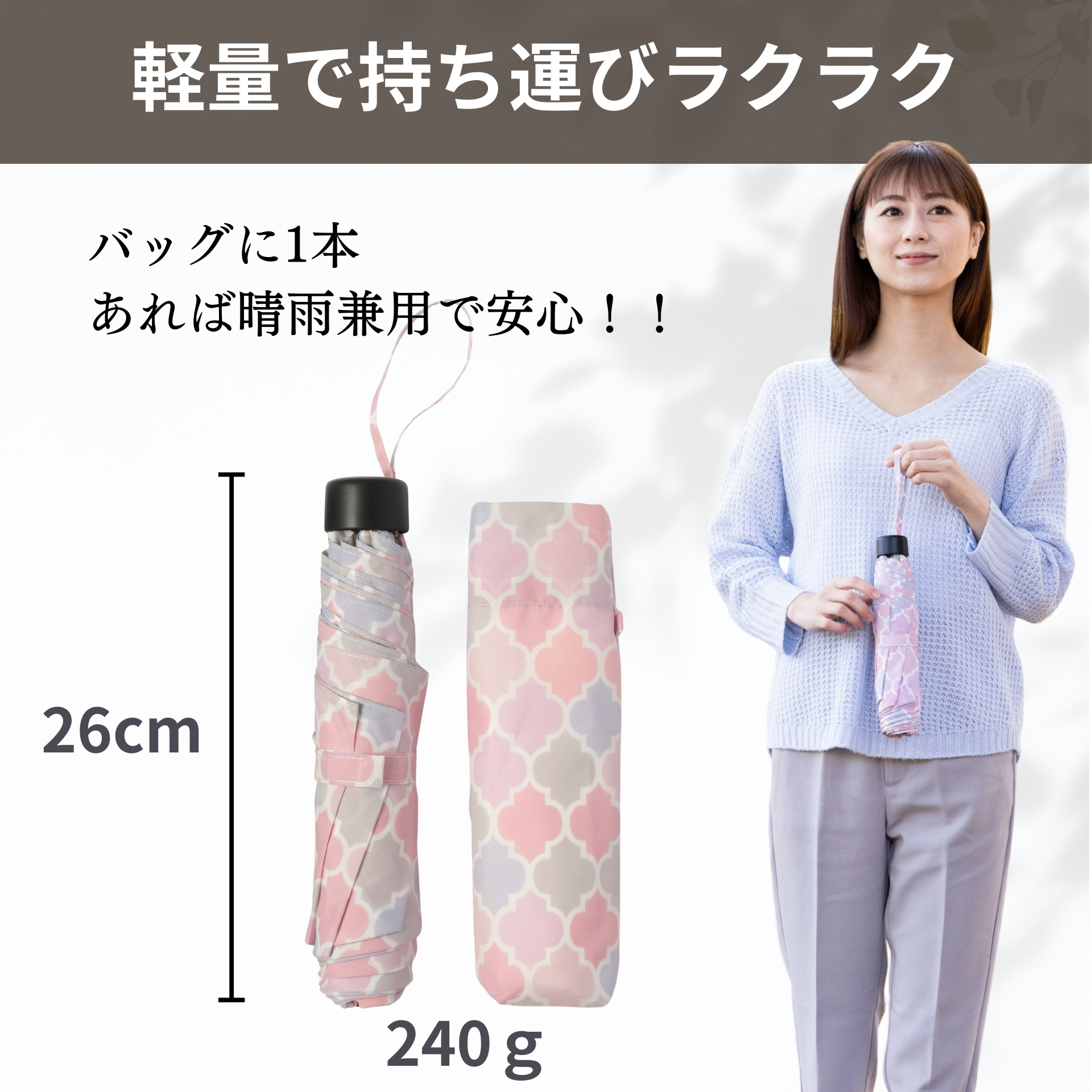 | UVカット率96%以上! 雨傘としても日傘としても使えます!! 折りたたみ傘としては大きい親骨60センチサイズ。3つ折タイプなので畳むとコンパクト。収納時の長さは26cm。カバンにも入ります!収納袋付き。 開閉時に骨をポキポキしなくても大丈夫な開閉簡単タイプ。 |