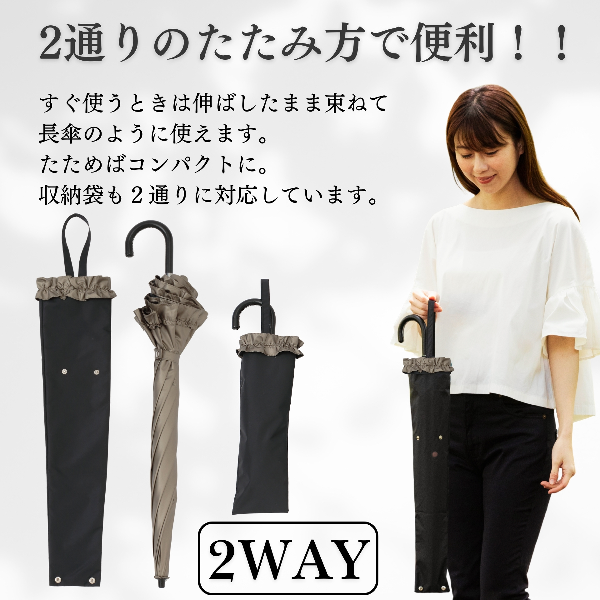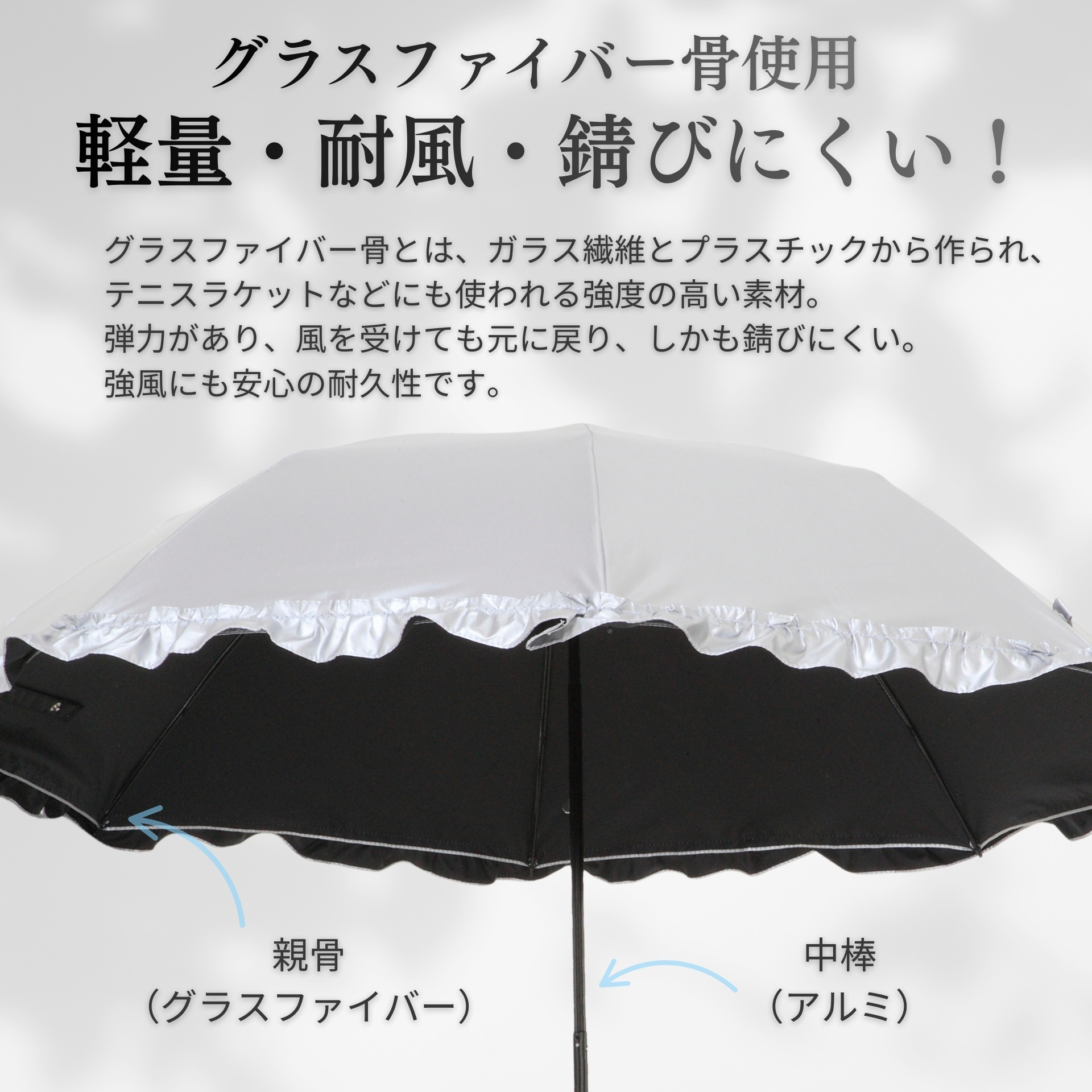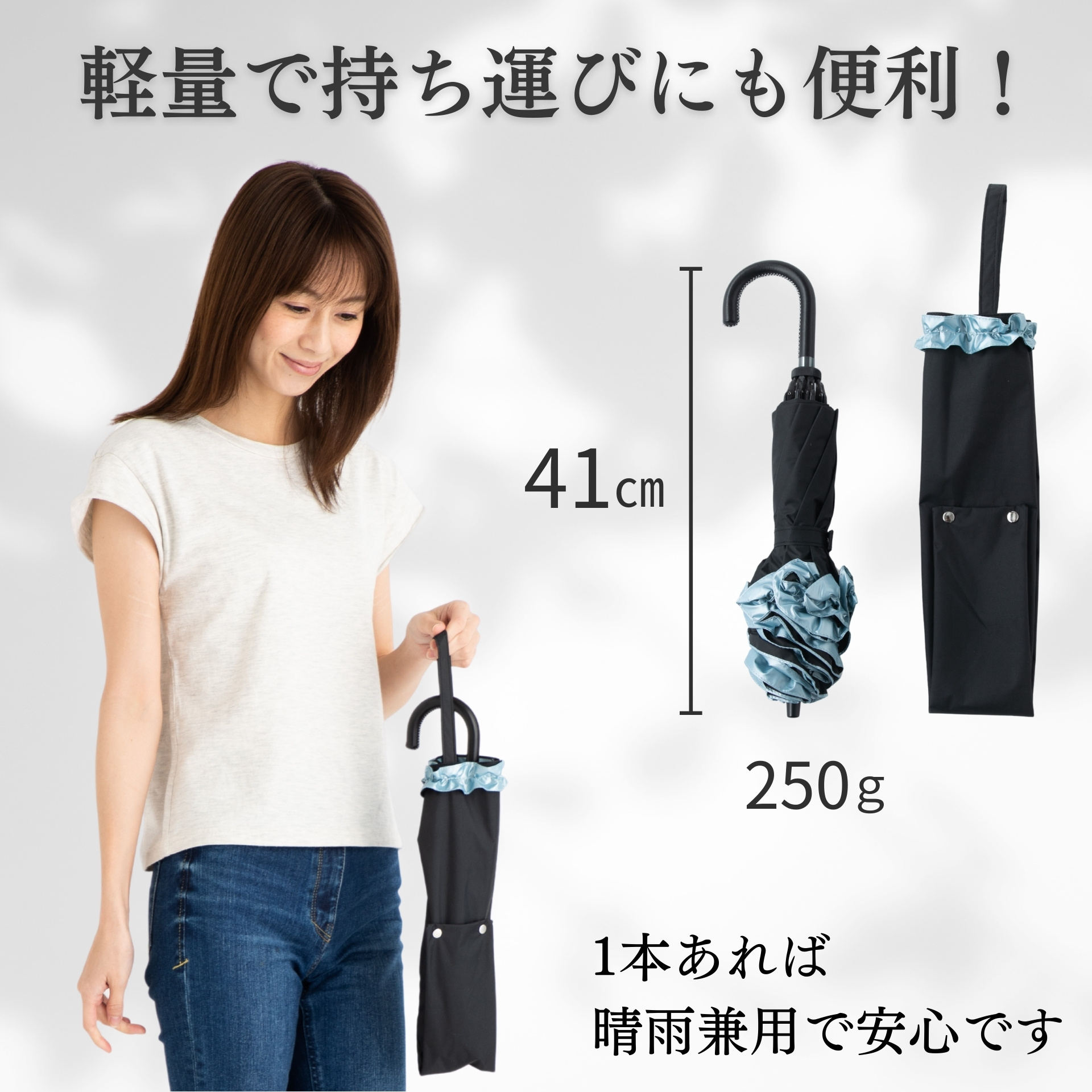 ■サイズ/親骨:50cm×8本骨、使用時全長:約75cm、収納時全長:約41cm、開傘時直径:約87cm、重さ:約250g ■傘骨カラー/親骨:ブラック、中棒:ブラック