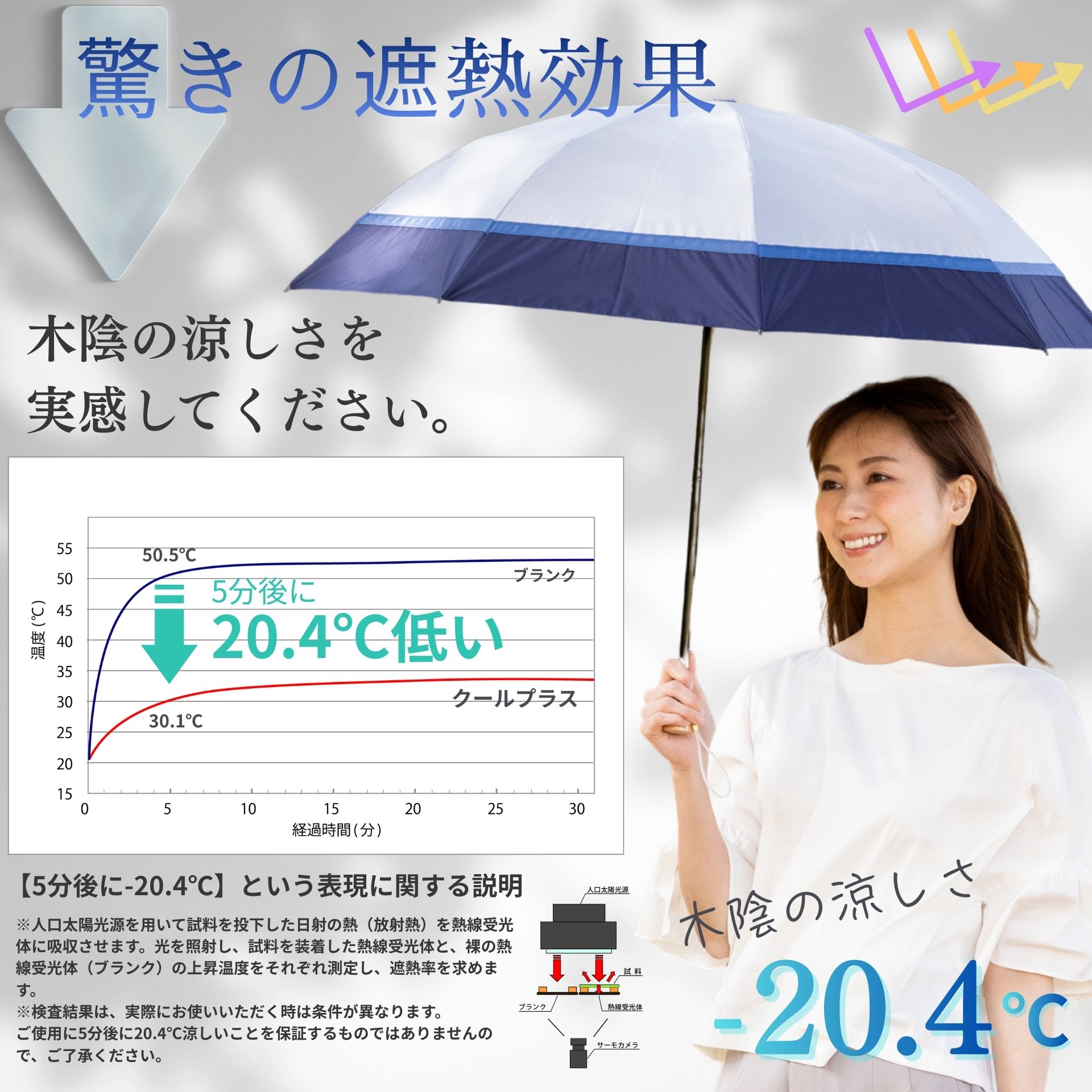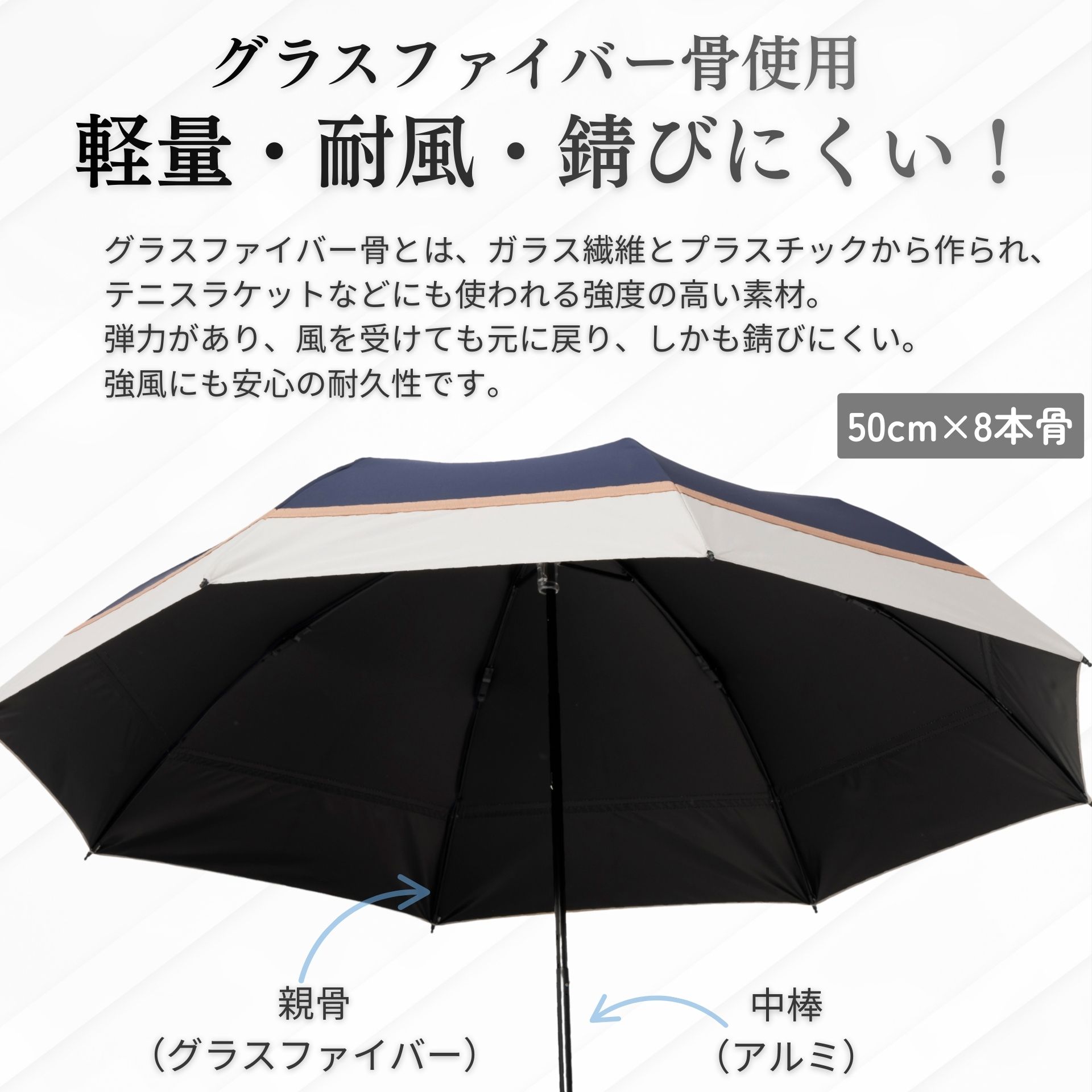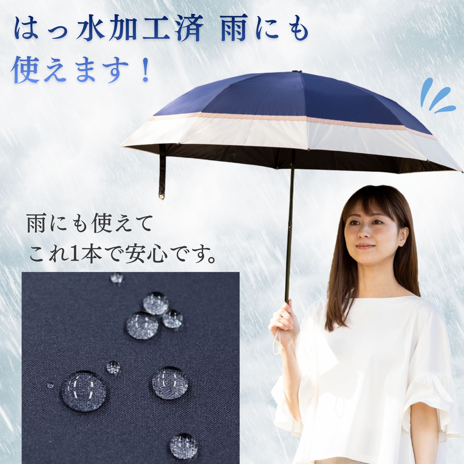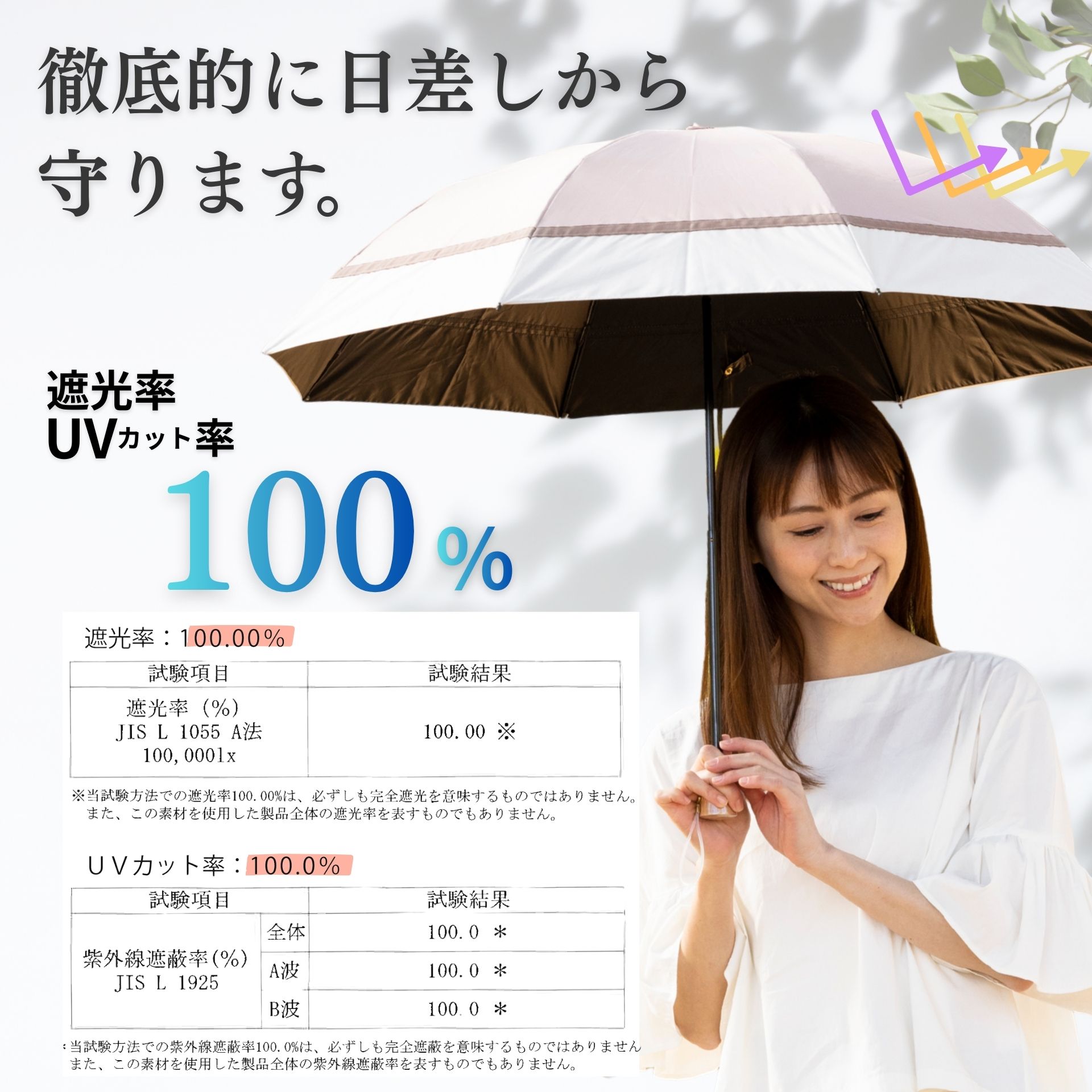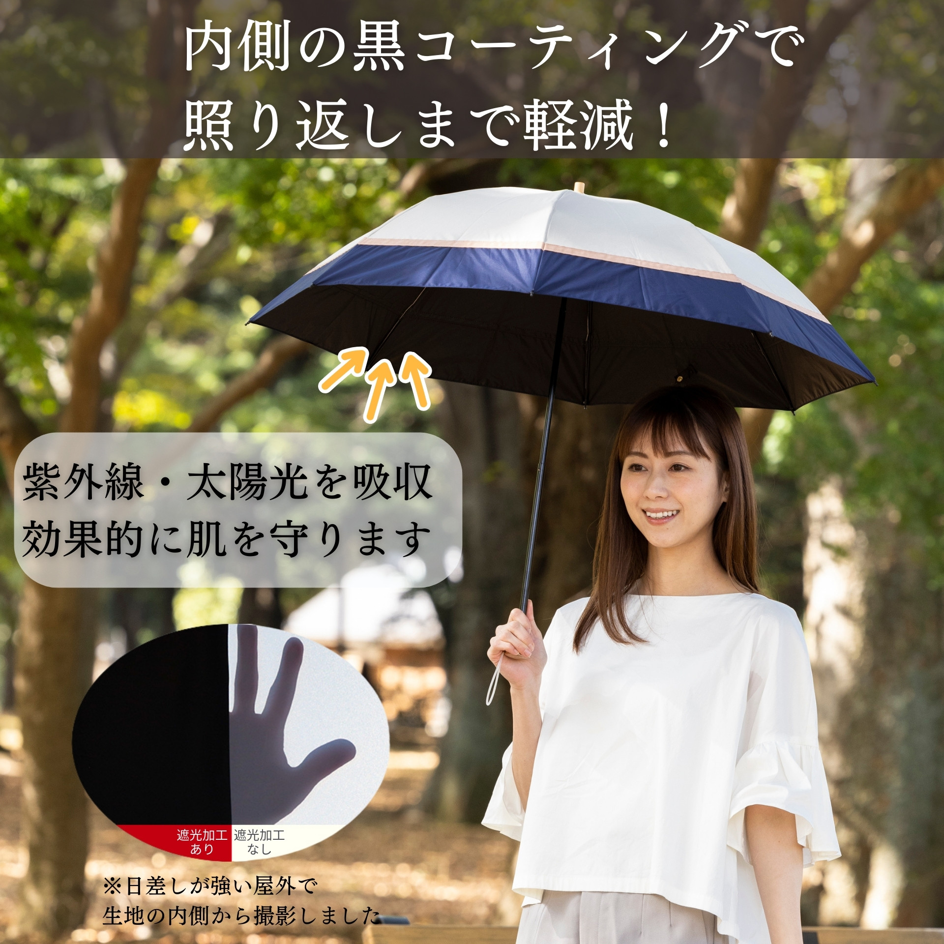 ■以下の点をご確認の上お買い求めください。 1.生地の検査結果は「遮光率100.00%」「UVカット率100.0%」となりますが、一般財団法人カケンテストセンターの見解の通り「完全遮光」を意味するものではありません。また傘として仕上げておりますので、ミシン縫製による縫い目から光が差し込むことがあります。 2.生地の特性上、光が透けて見えるとても小さな穴(ピンホール)がある場合があります。これは製造工程上避けられないことで、ピンホールがあっても、雨が濡れることもありません。そのため僅かなピンホールは良品として販売しております。ご了承くださいませ。 3. 生地に撥水加工が施してありますので、雨の日も使える晴雨兼用タイプです。雨傘としてご使用になられた後は、乾かしてからおしまいください。 4.ポリウレタンコーティングの性質上、尖ったものや固いものとの摩擦により、コーティングがはがれる恐れがあります。ご了承ください。 5.生地の特性上、開封時に素材の臭いが感じられる場合があります。数日のご使用や陰干しなどで自然に軽減されていきます。 |