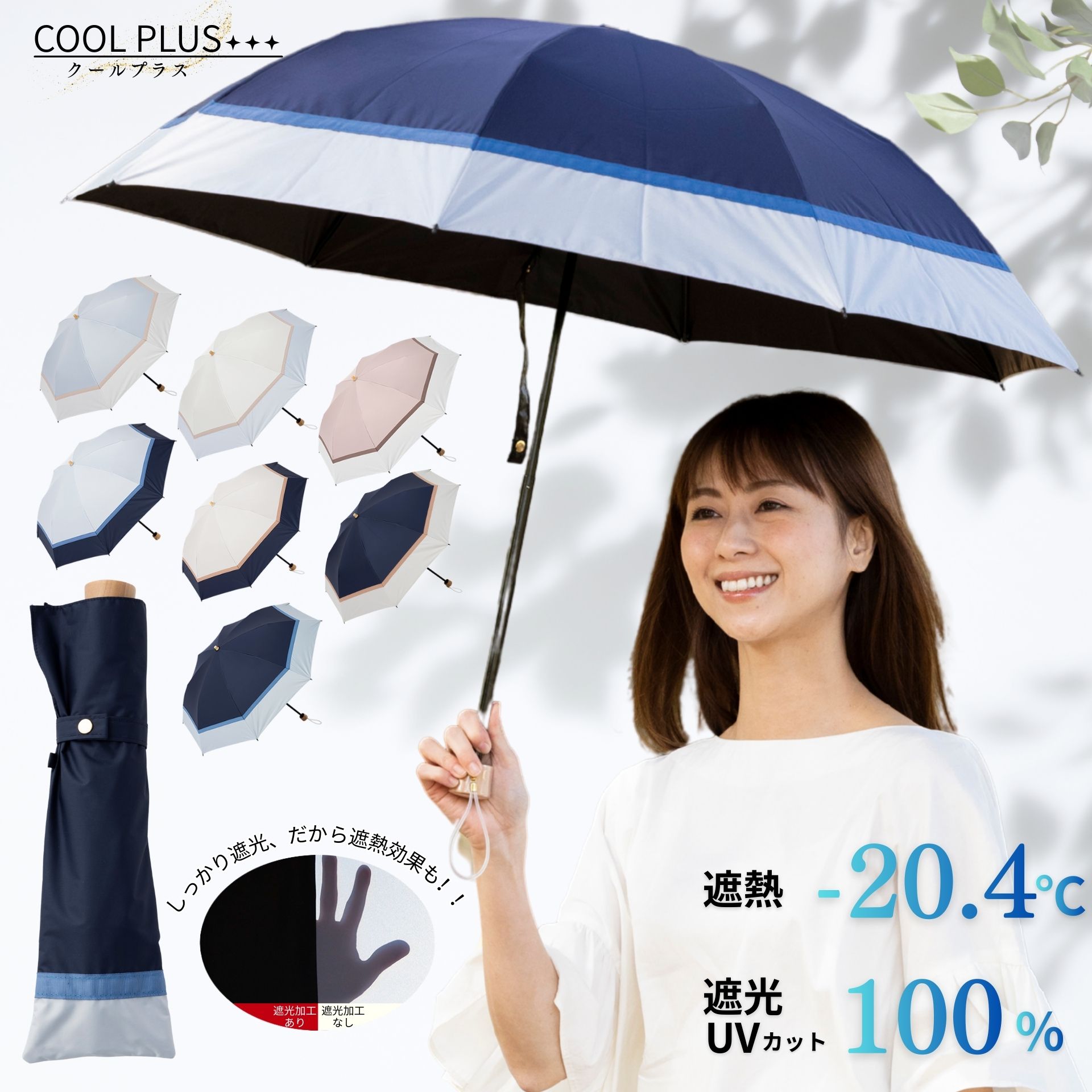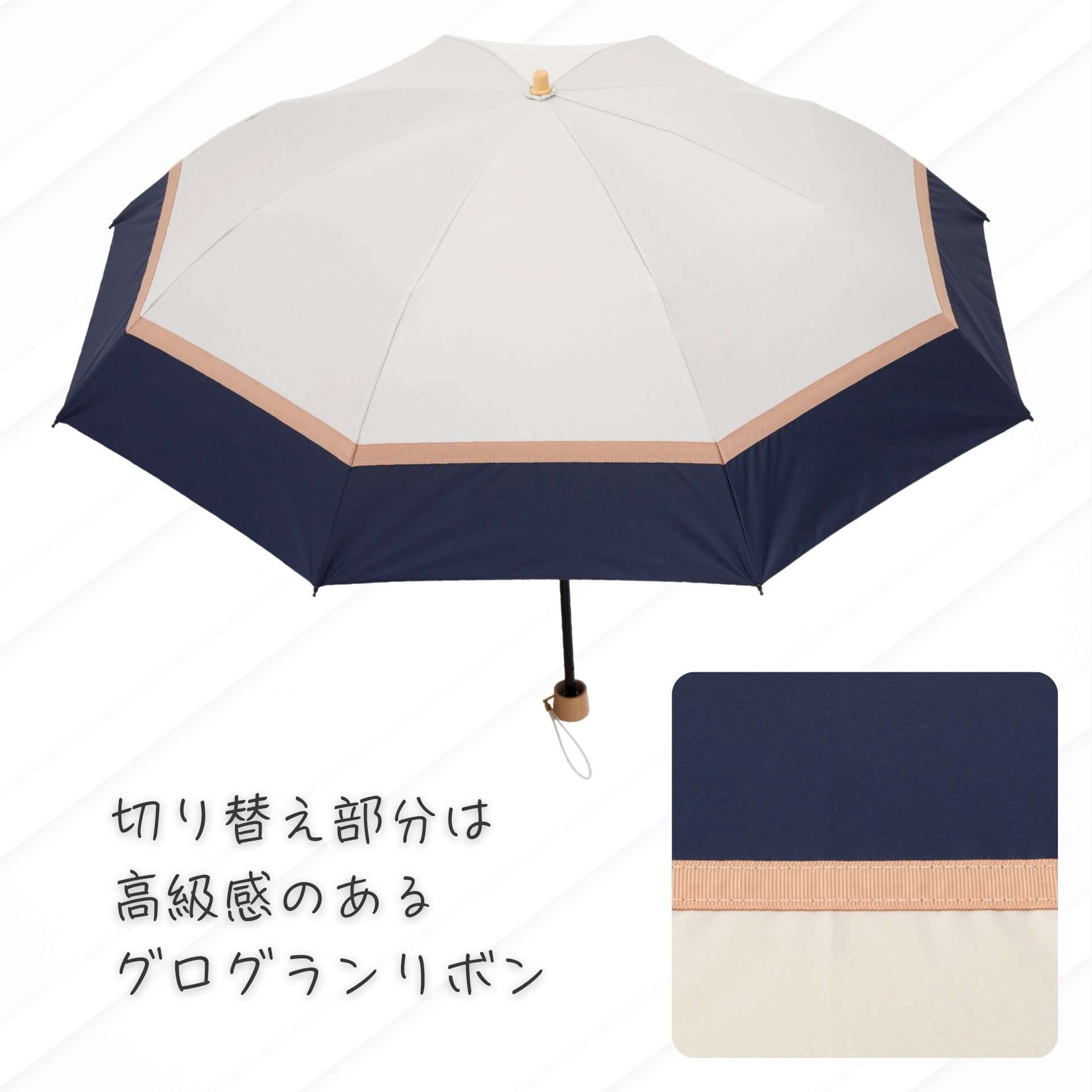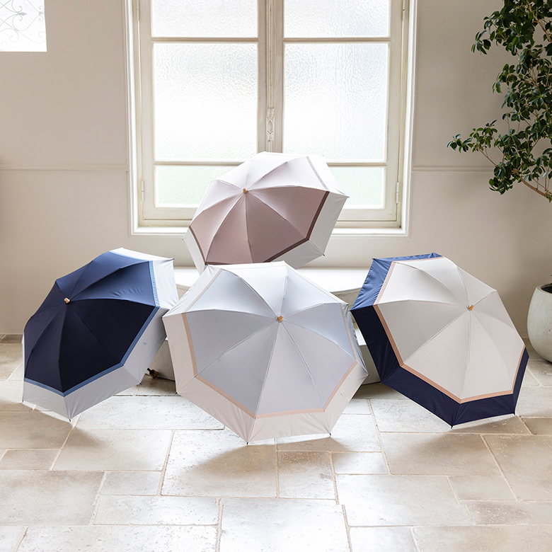 リーベンオリジナル1級遮光日傘<クールプラス> 遮光率100%、UVカット率100%、遮熱効果のある機能性生地を使用。 2色の生地を立体感のあるグログランリボンで切り継いで、上品な配色に仕上げました。 内側はブラックで地面からの照り返しを吸収し、顔への照りの集中を防ぎます。 持ち運びに便利な折り畳み傘。収納袋付き。 カラーバリエーション豊富。