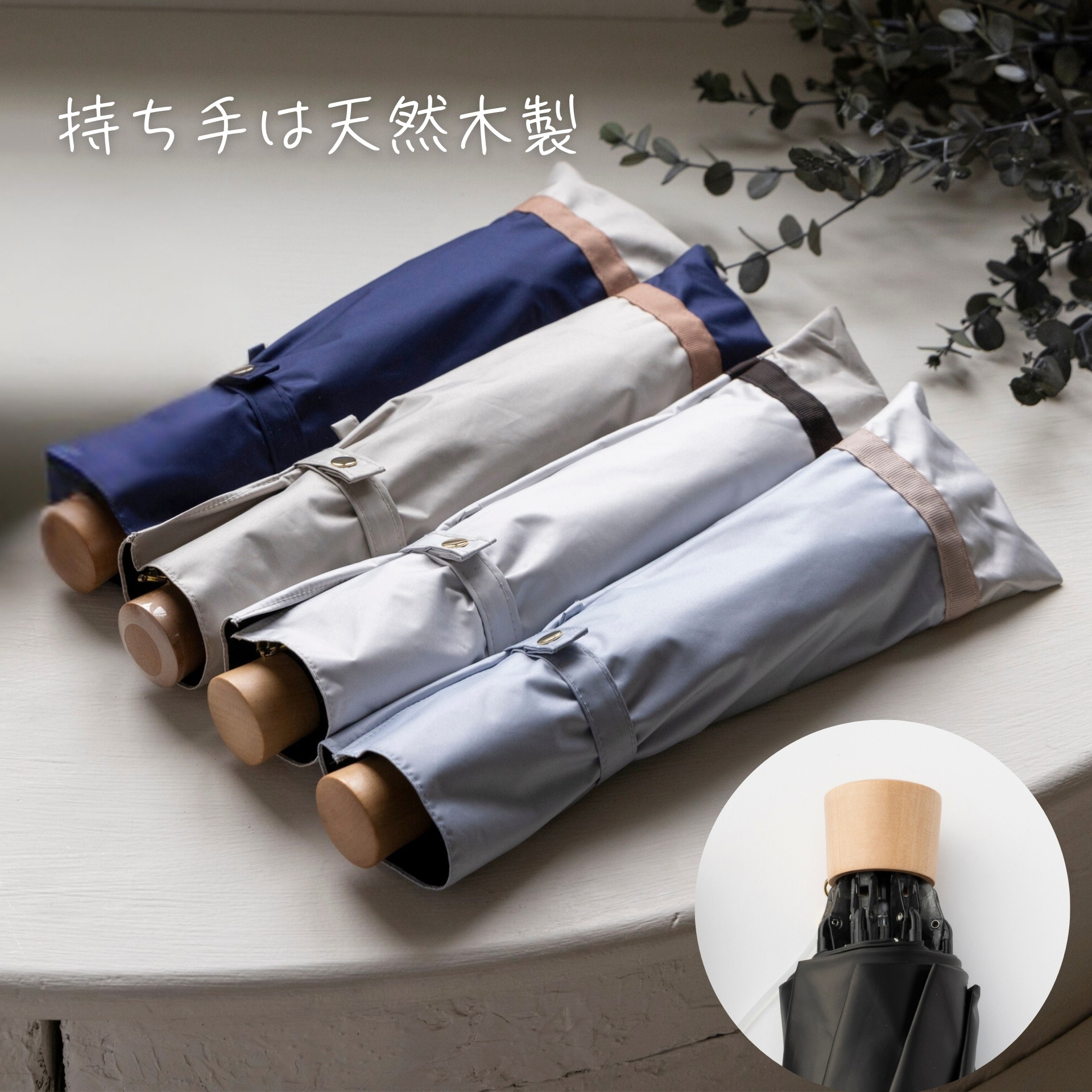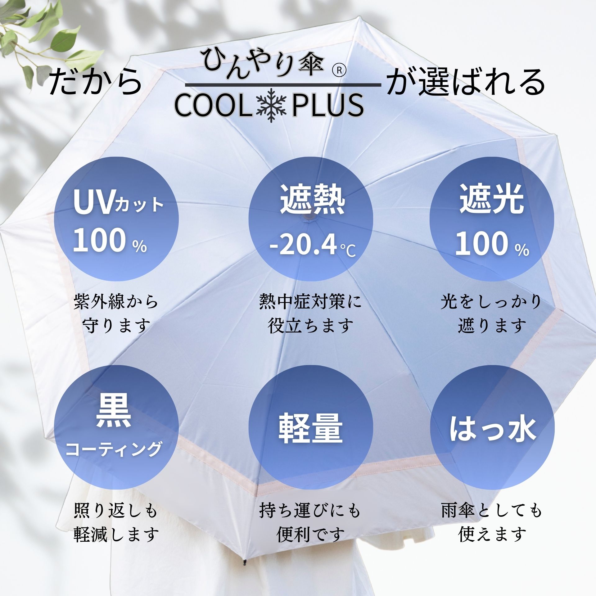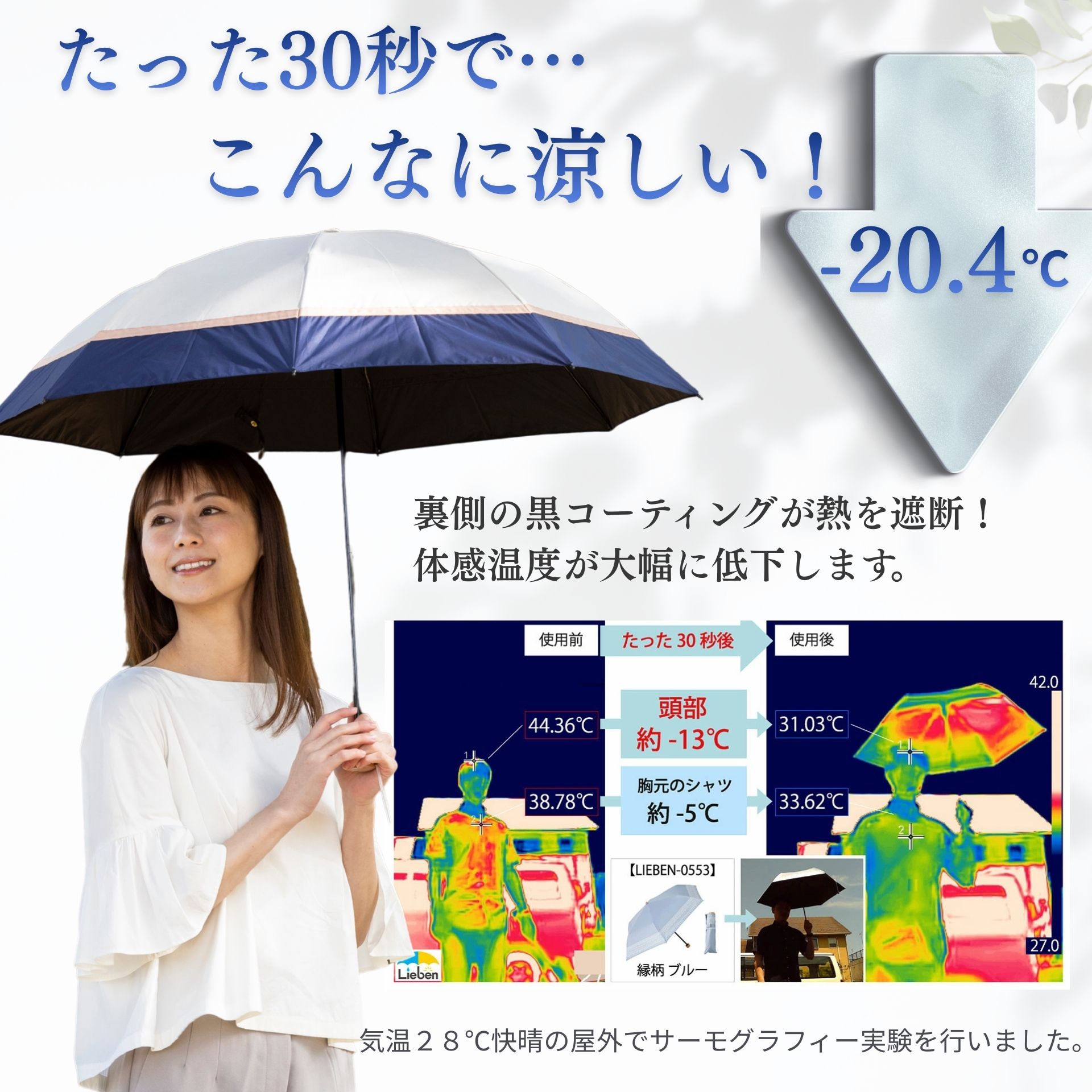 リーベンオリジナル1級遮光日傘<クールプラス> 遮光率100%、UVカット率100%、遮熱効果のある機能性生地を使用。 2色の生地を立体感のあるグログランリボンで切り継いで、上品な配色に仕上げました。 内側はブラックで地面からの照り返しを吸収し、顔への照りの集中を防ぎます。 持ち運びに便利な折り畳み傘。収納袋付き。 カラーバリエーション豊富。