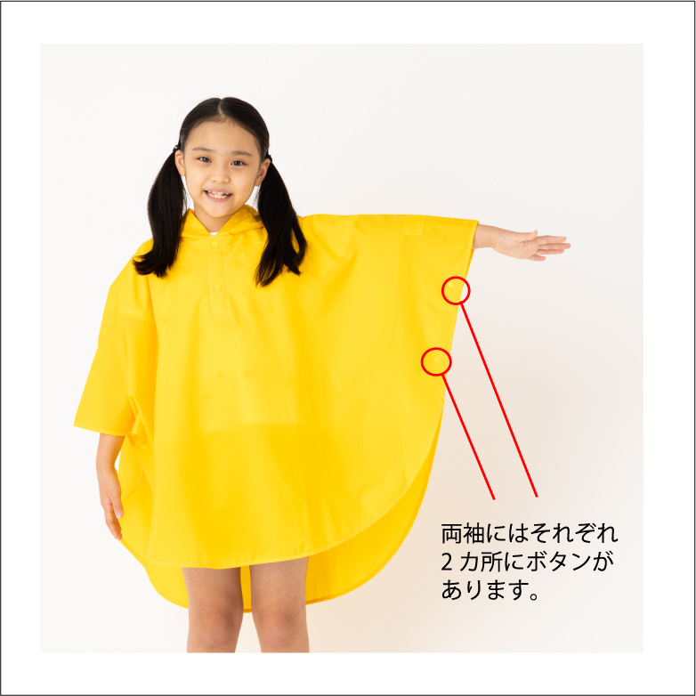傘屋さんが作った子供用のレインポンチョです。 はっ水加工が施された傘生地で作りました。 内側には収納袋が縫い付けてあり、コンパクトに収納が可能。 反射テープ付きで、暗い道でも視認性がアップ!ランドセルを背負ったままでも着られるように、ポンチョの後ろを長くしています。 両袖にはそれぞれ2カ所にボタンがあります。 男の子でも女の子でもお使い頂けます。 ネイビー・イエロー・ラベンダー(ピンクパープル)の3色展開。