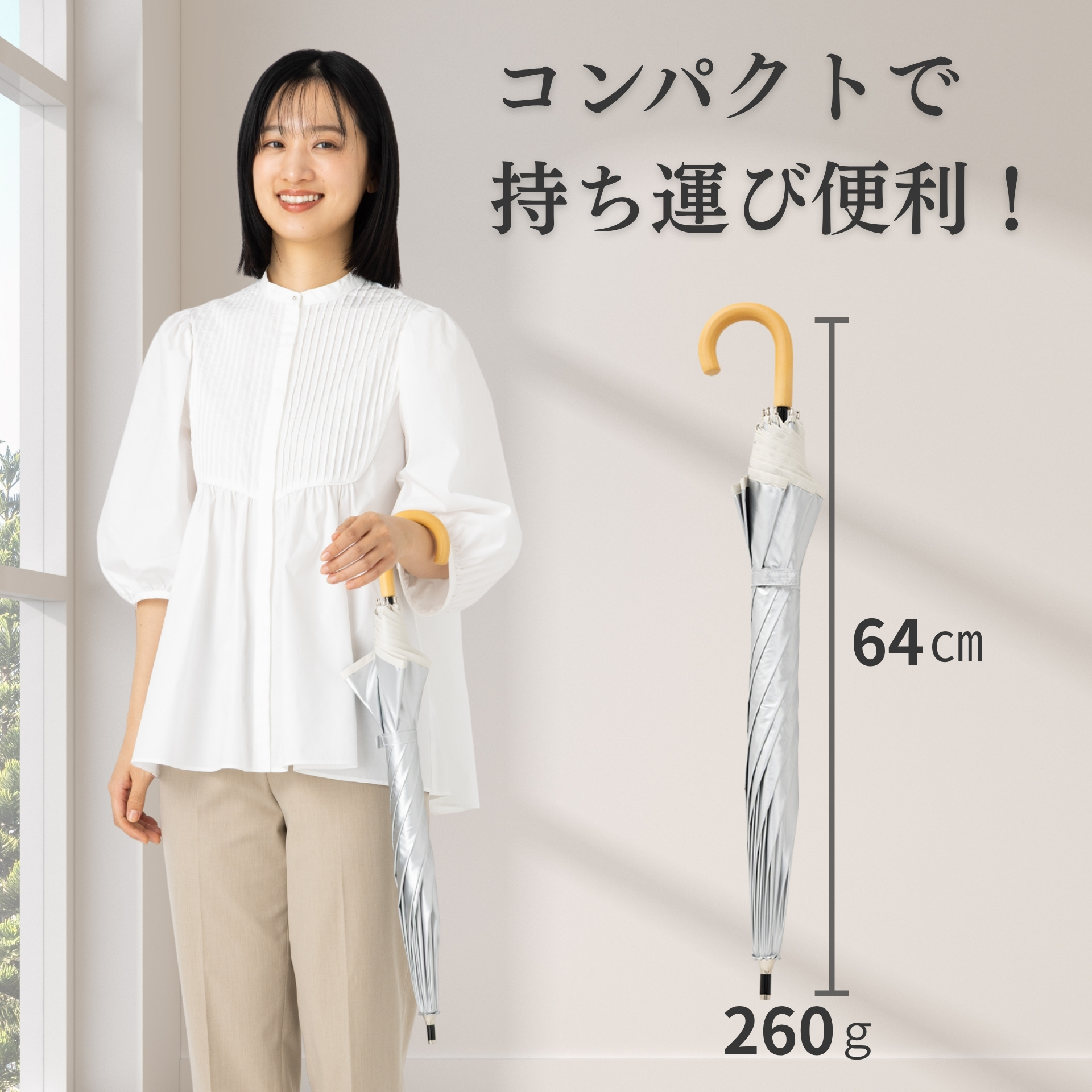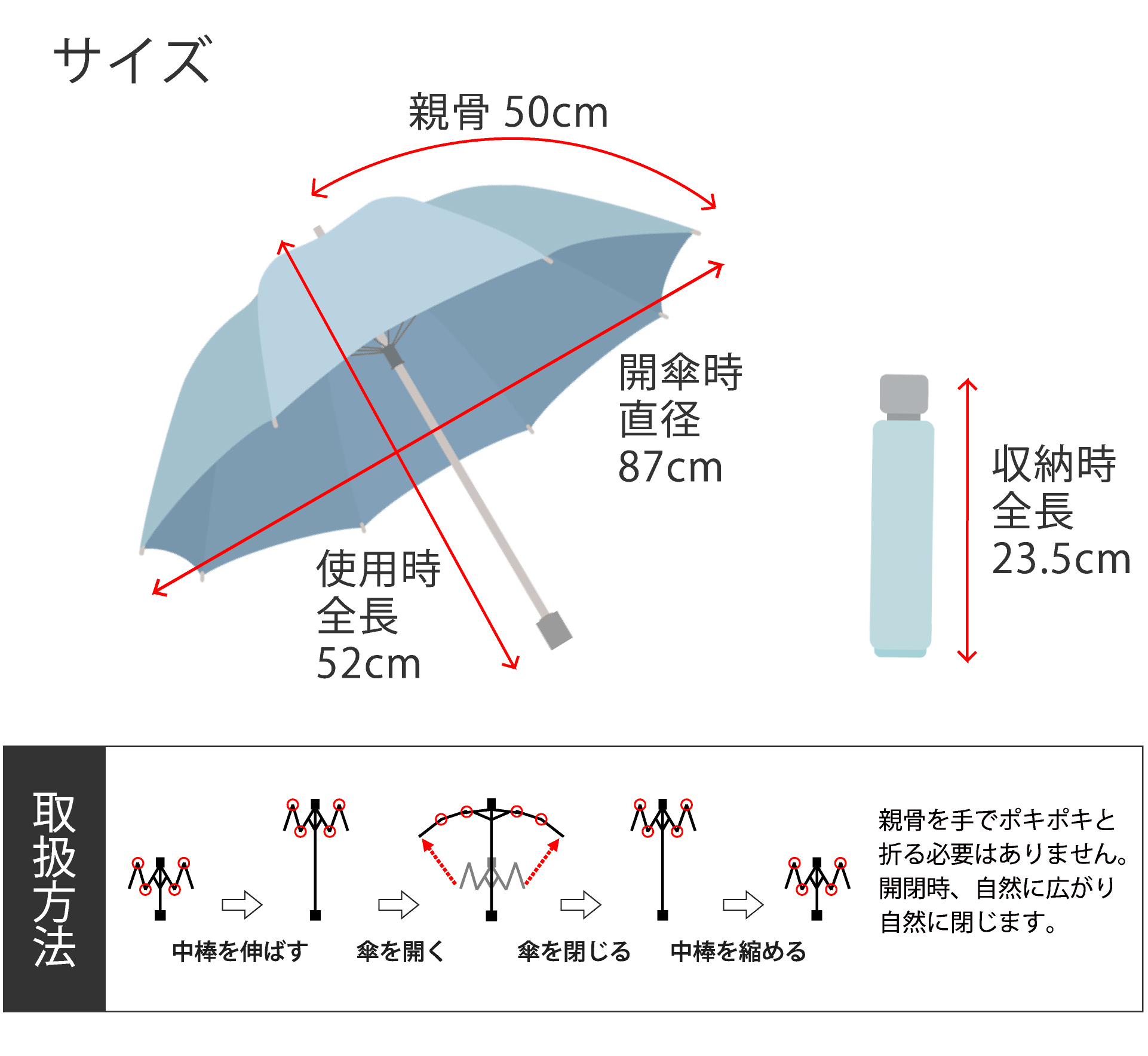 ■サイズ:親骨50cm×8本骨 全長:約64cm 収納時全長:64cm 開傘時直径:約83cm 重さ:約260g