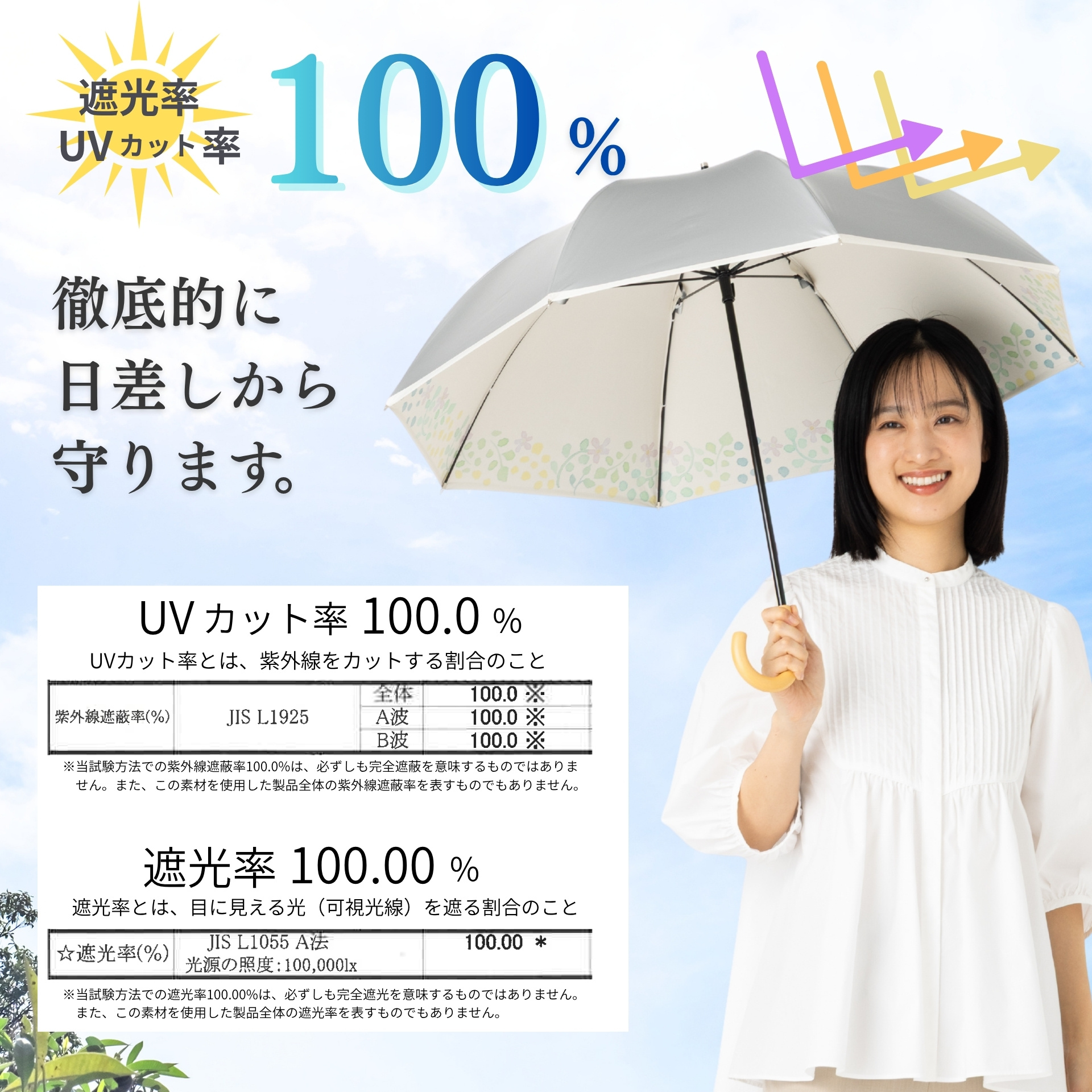 ■UVカット率:100.0%(A波100.0%、B波100.0%) ■遮光率:100.00% ■遮熱加工